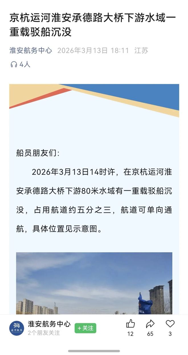 3月13日晚18点左右,淮安航务中心在其官方微信公众号上发文提醒船员沉船位置,过往船舶航行至此水域时加强瞭望、注意避让,确保航行安全。