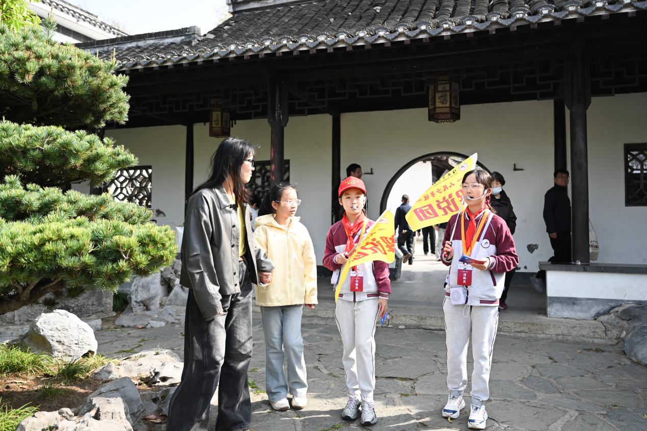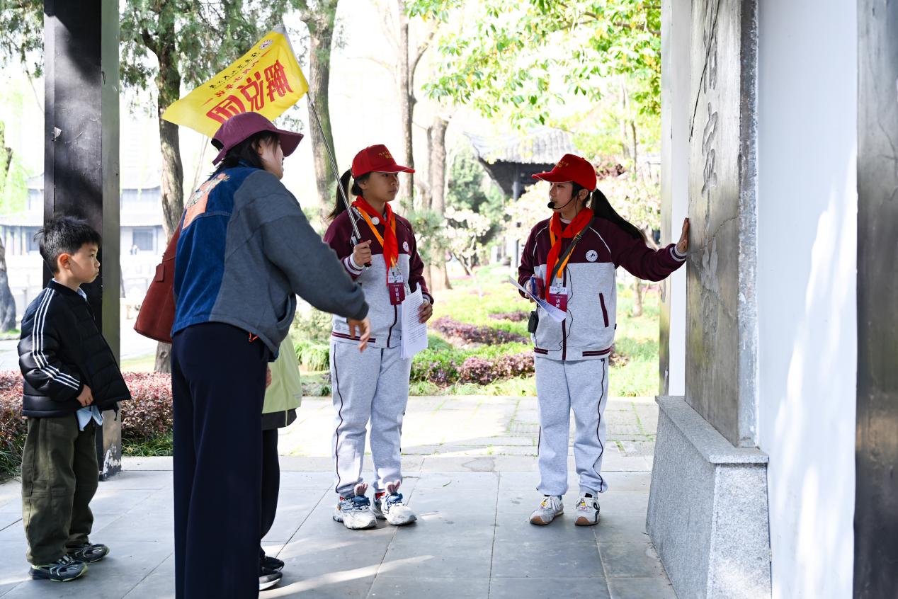 从园林入口到深处庭院,小讲解员们的身影穿梭在亭台楼阁之间,稚嫩的脸庞、认真的模样、生动的讲解,让整个清晏园都充满了朝气。他们没有刻板的话术,而是用少年独有的视角和语气讲述历史,面对游客的提问也能从容应答,既展现了人民小学少先队员的良好风貌,也让游客们在游览的同时,真正读懂了古园背后的文化底蕴。