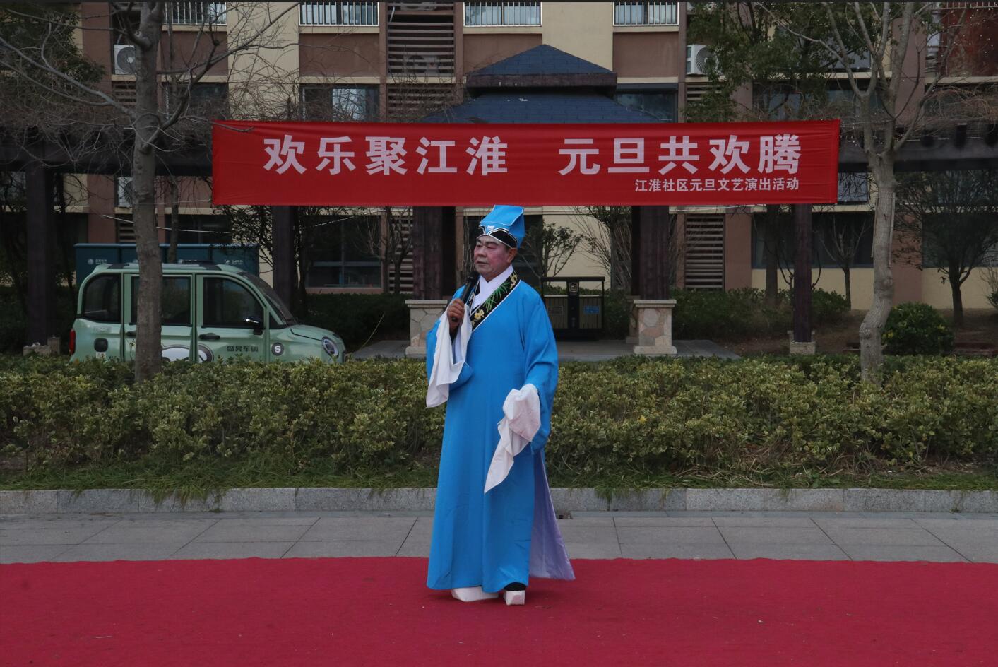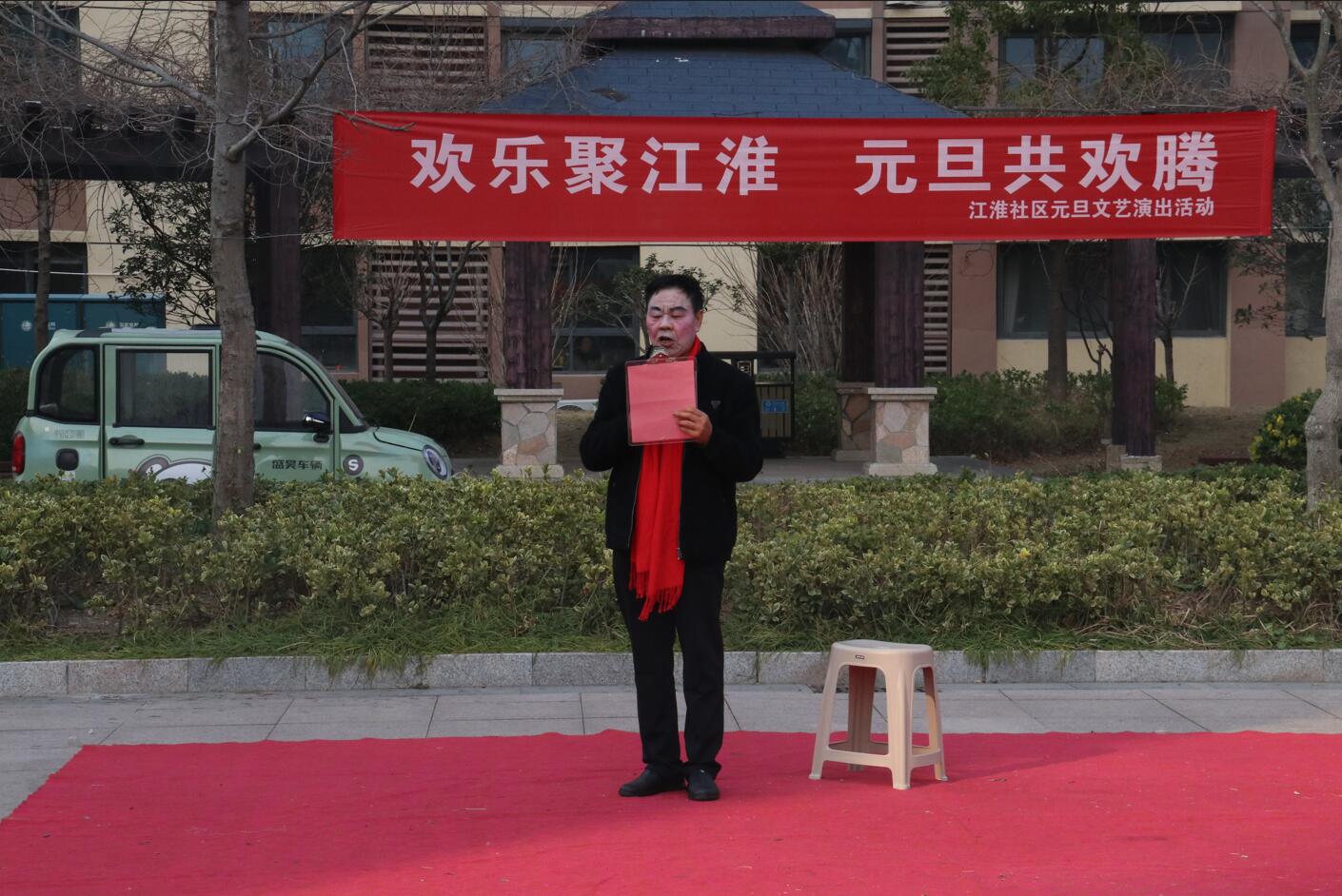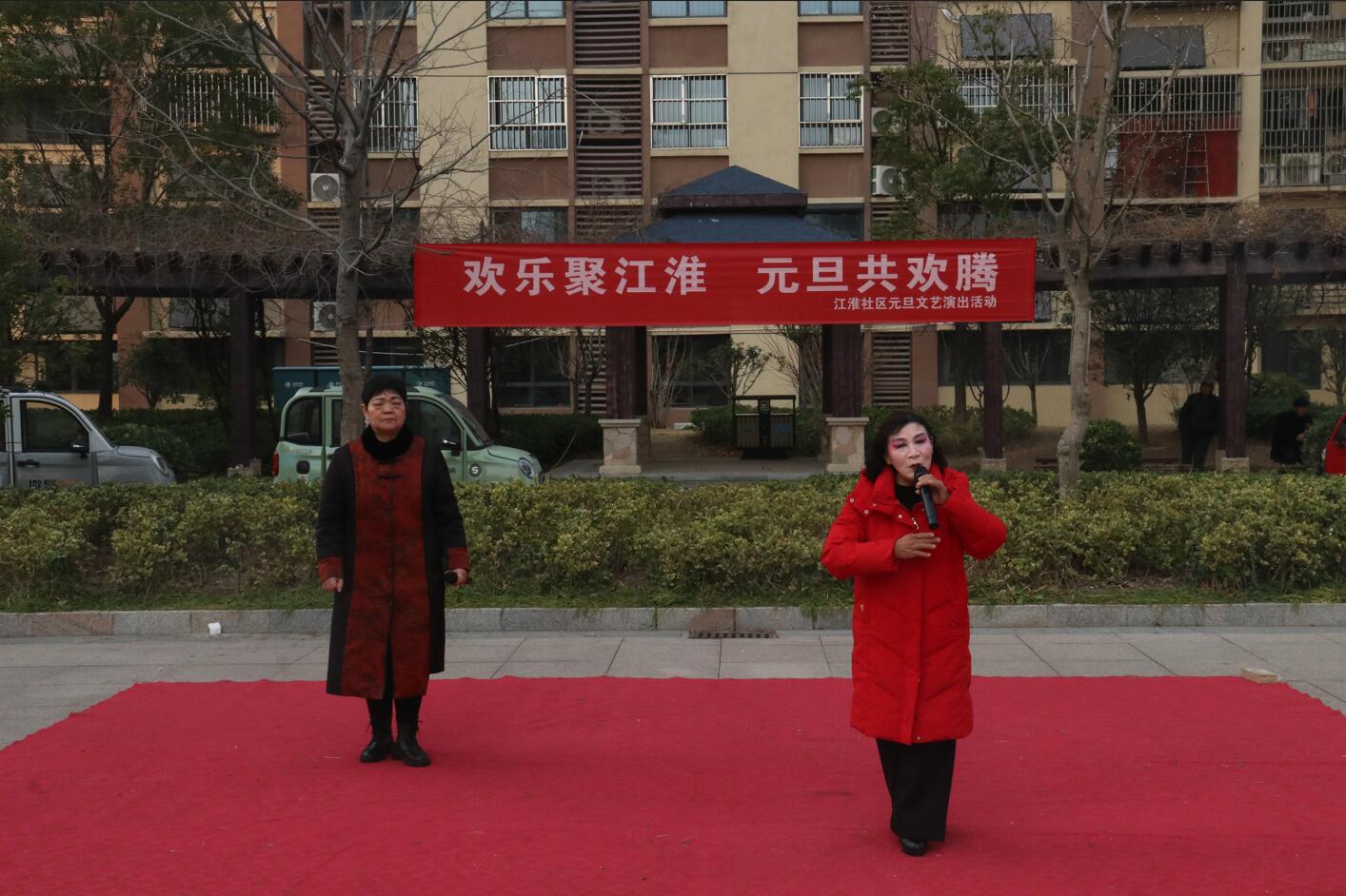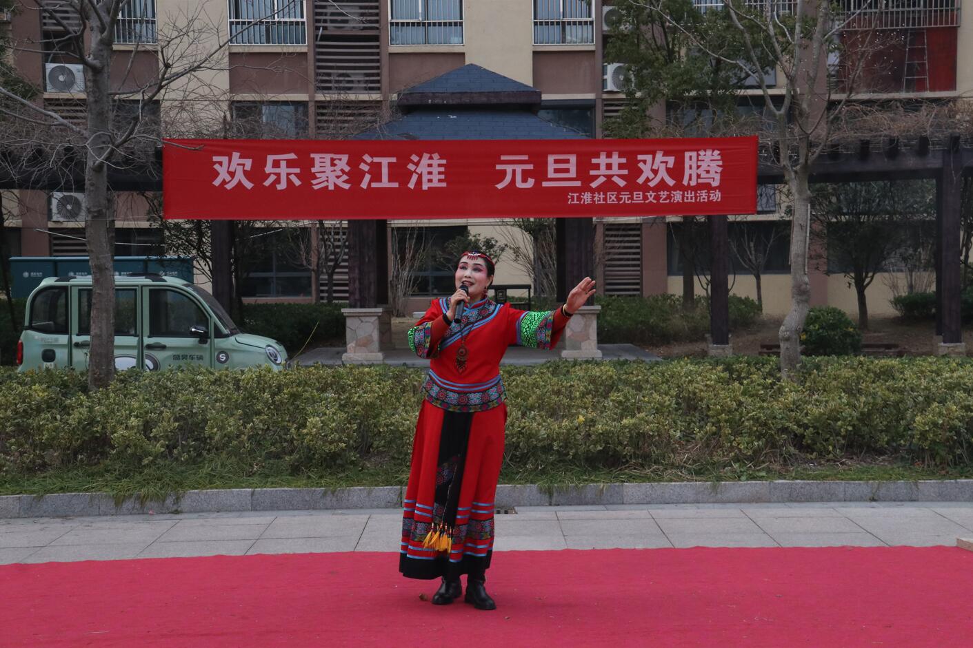 活动现场布置喜庆温馨,红色地毯铺展于小区广场中央,背景横幅上“欢乐聚江淮 元旦共欢腾”的标语格外醒目。伴随着主持人孙、张、刘三位热情洋溢的开场白,演出在一片祝福声中正式拉开帷幕:“新年快乐!身体健康、工作顺利!心想事成、家庭幸福安康!”一句句真挚的祝福,拉近了邻里之间的距离,也点燃了全场观众的热情。