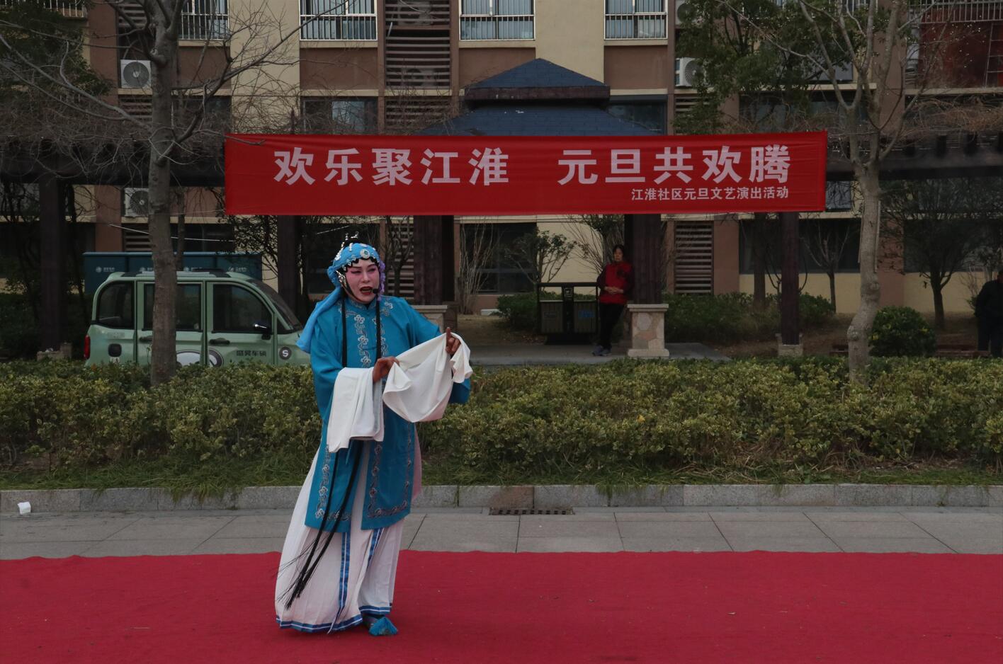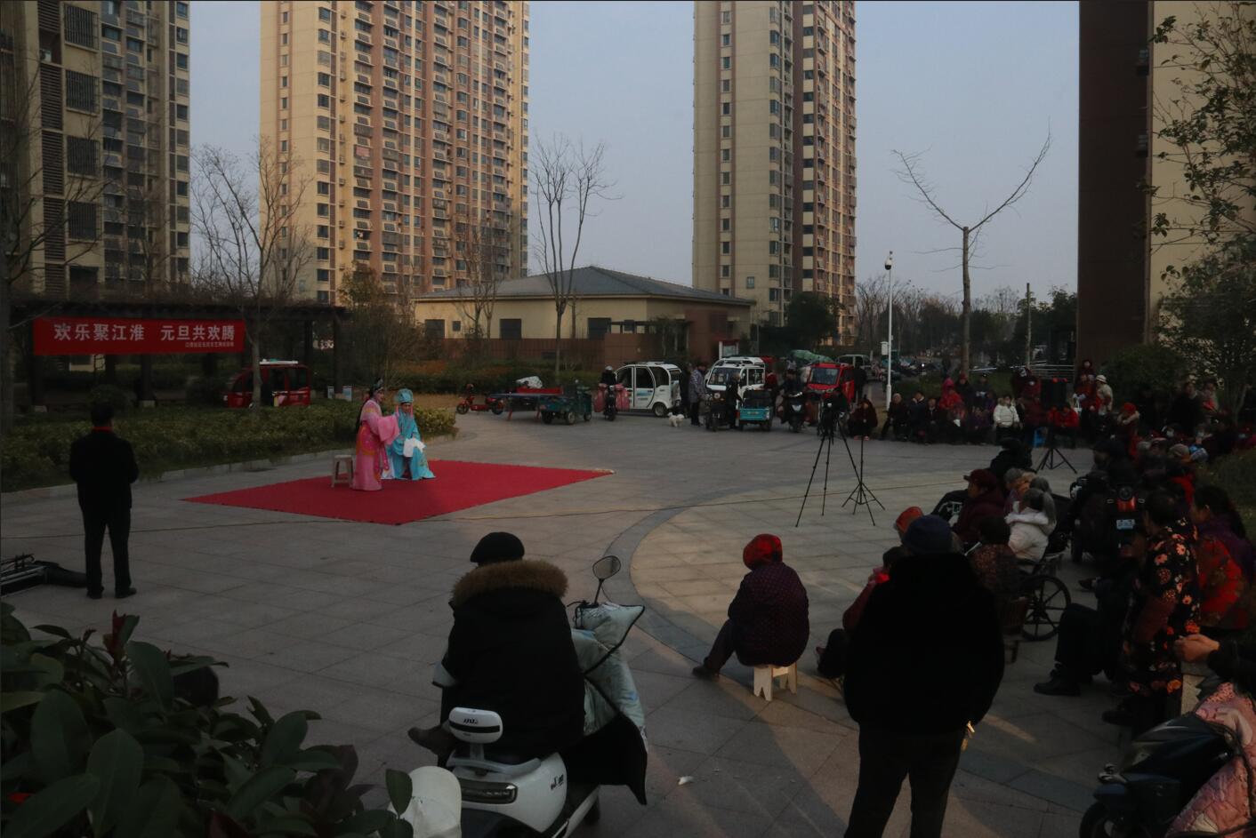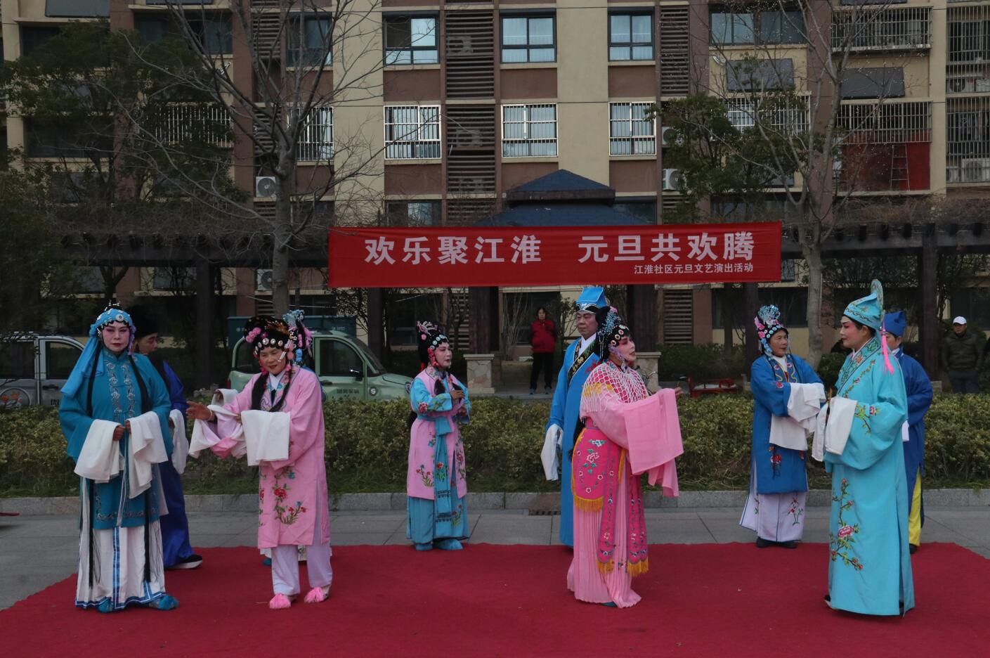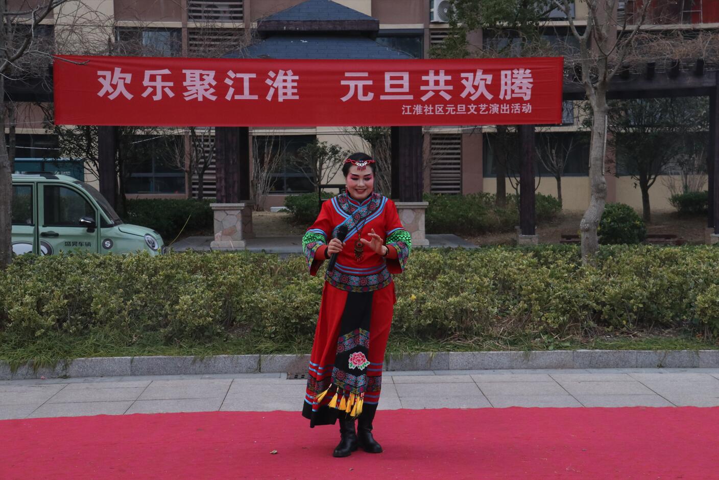 活动现场布置喜庆温馨,红色地毯铺展于小区广场中央,背景横幅上“欢乐聚江淮 元旦共欢腾”的标语格外醒目。伴随着主持人孙、张、刘三位热情洋溢的开场白,演出在一片祝福声中正式拉开帷幕:“新年快乐!身体健康、工作顺利!心想事成、家庭幸福安康!”一句句真挚的祝福,拉近了邻里之间的距离,也点燃了全场观众的热情。