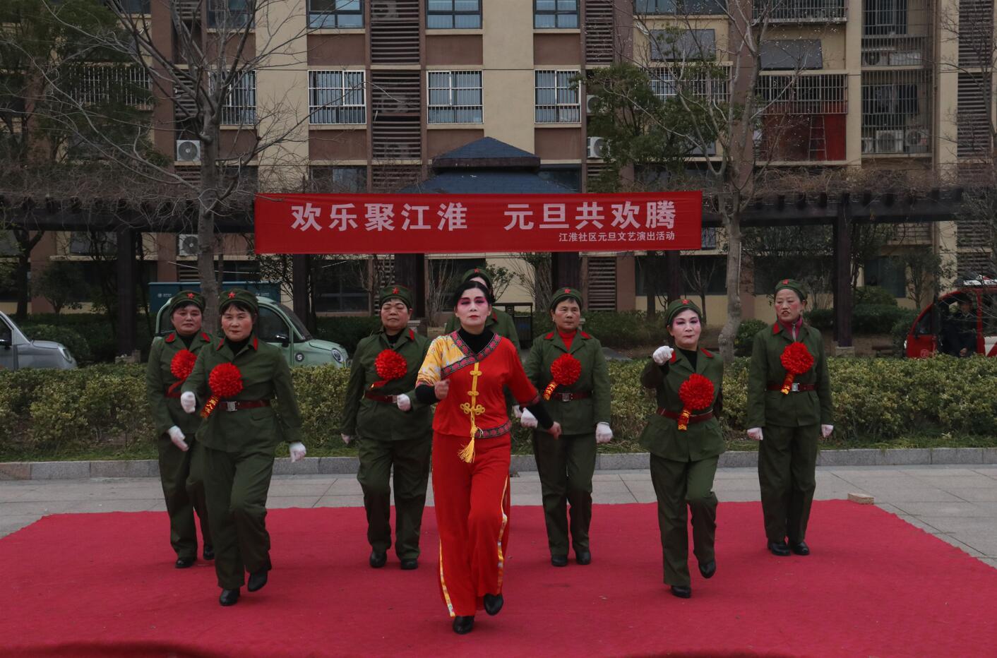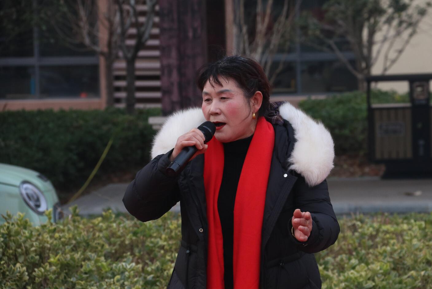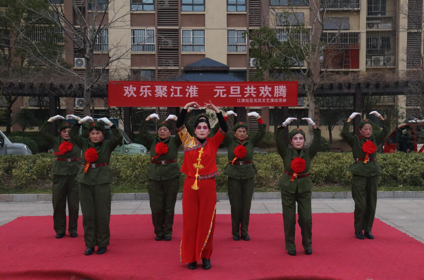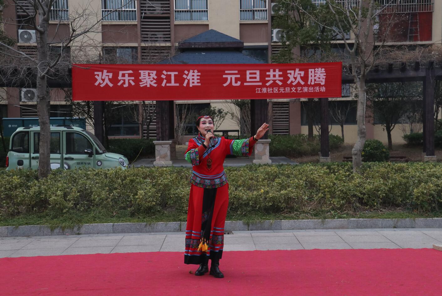 活动现场布置喜庆温馨,红色地毯铺展于小区广场中央,背景横幅上“欢乐聚江淮 元旦共欢腾”的标语格外醒目。伴随着主持人孙、张、刘三位热情洋溢的开场白,演出在一片祝福声中正式拉开帷幕:“新年快乐!身体健康、工作顺利!心想事成、家庭幸福安康!”一句句真挚的祝福,拉近了邻里之间的距离,也点燃了全场观众的热情。