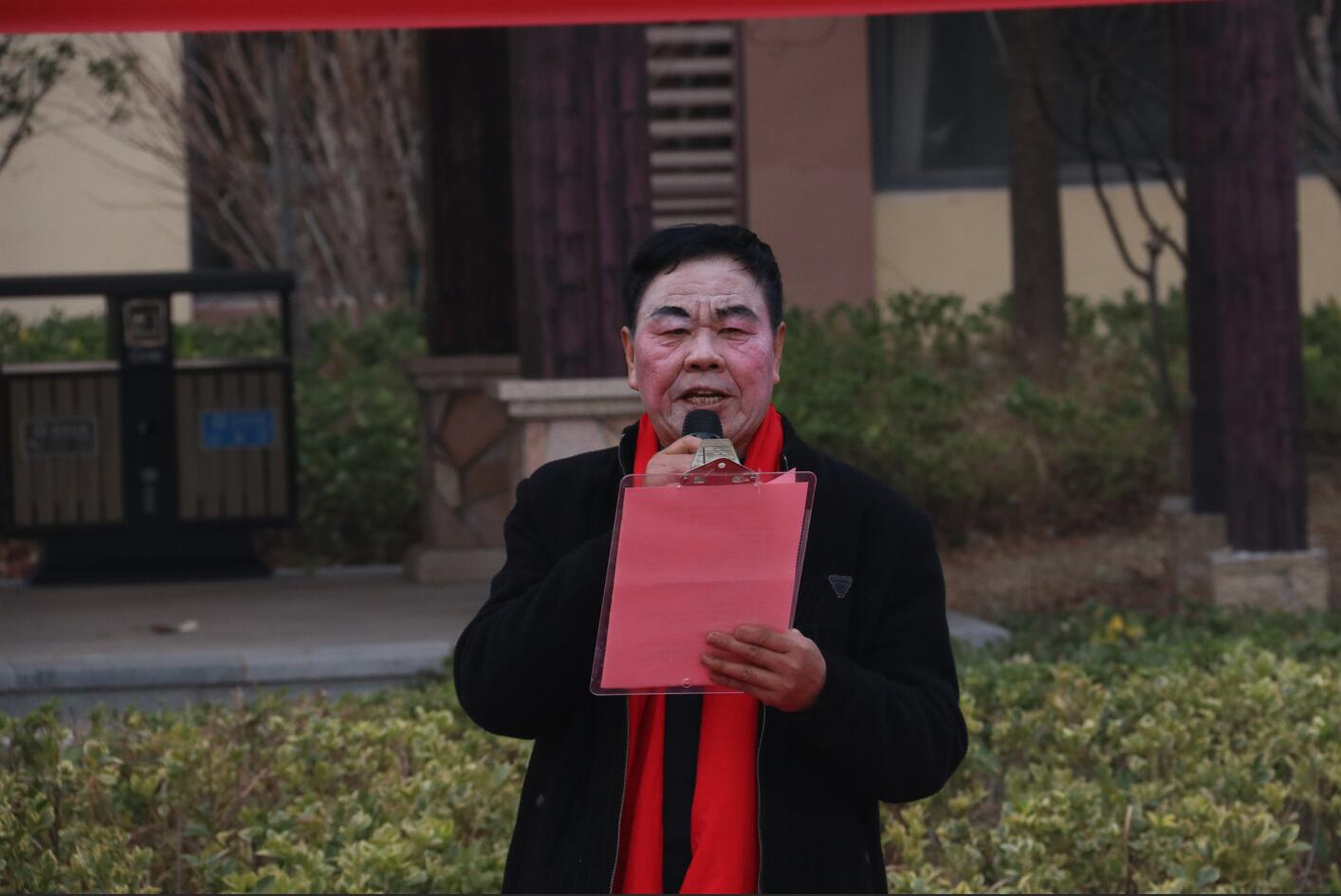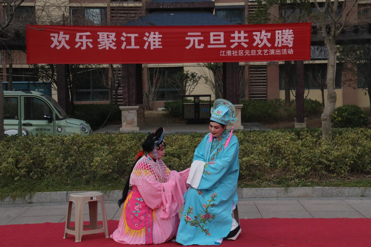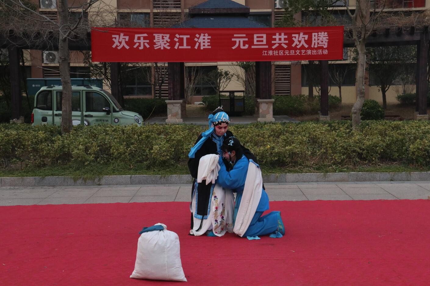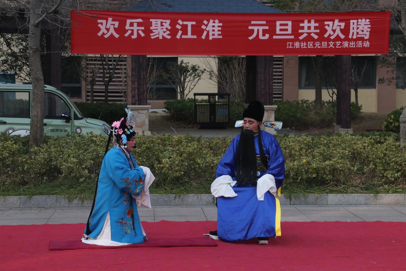活动现场布置喜庆温馨,红色地毯铺展于小区广场中央,背景横幅上“欢乐聚江淮 元旦共欢腾”的标语格外醒目。伴随着主持人孙、张、刘三位热情洋溢的开场白,演出在一片祝福声中正式拉开帷幕:“新年快乐!身体健康、工作顺利!心想事成、家庭幸福安康!”一句句真挚的祝福,拉近了邻里之间的距离,也点燃了全场观众的热情。