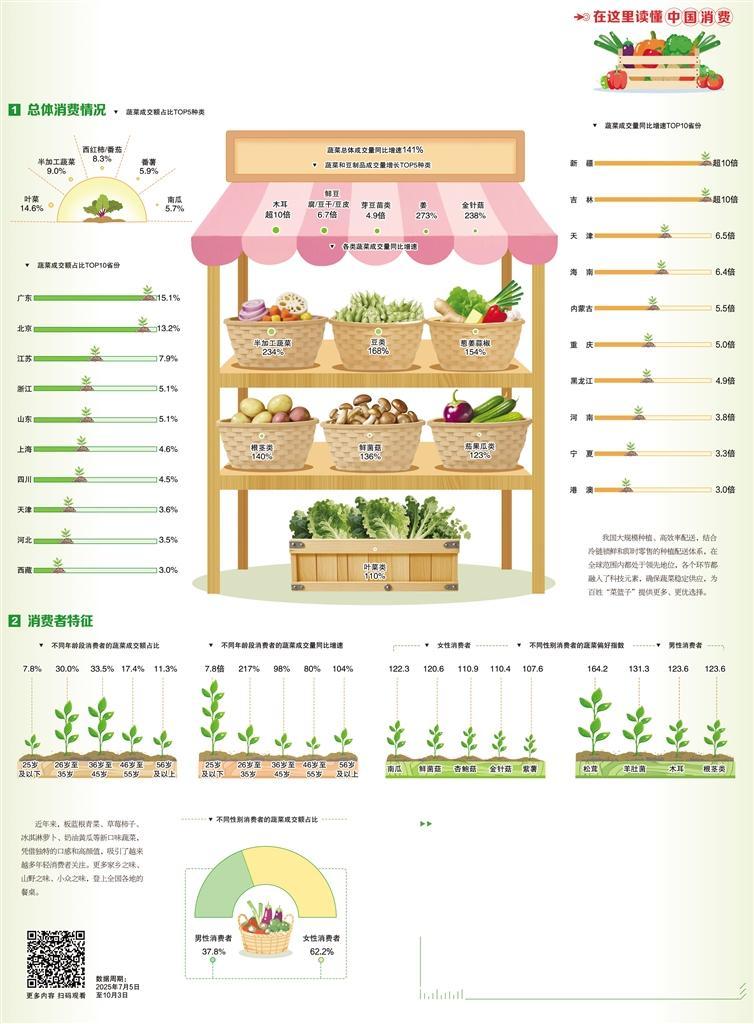我们不仅会种菜,也爱吃菜。数据统计,我国人均年蔬菜占有量为500多公斤,是世界平均水平的3倍多。随着生活水平持续提升、健康饮食理念普及和低碳环保意识的增强,人们对蔬菜的需求不再仅限于饱腹解腻,而是转向吃优特、吃健康,蔬菜消费结构正在发生变化。
